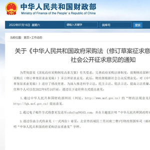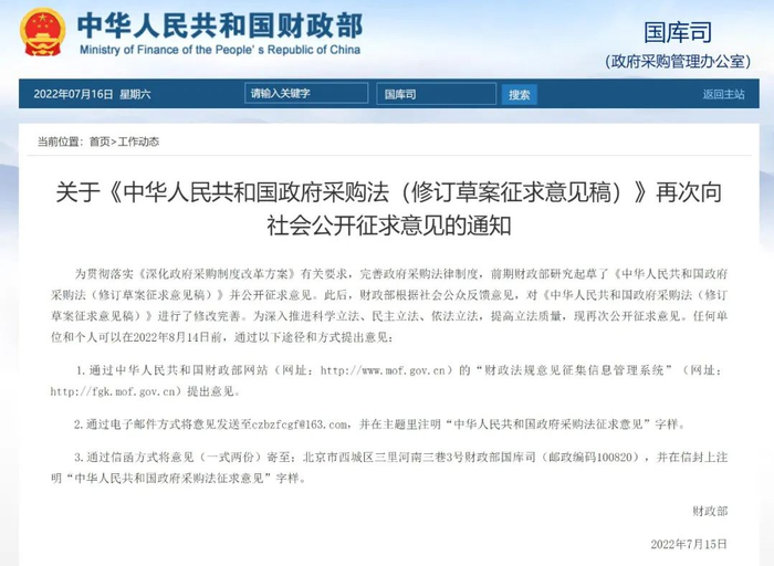 为贯彻落实《深化政府采购制度改革方案》有关要求,完善政府采购法律制度,前期财政部研究起草了《中华人民共和国政府采购法(修订草案征求意见稿)》并公开征求意见。此后,财政部根据社会公众反馈意见,对《中华人民共和国政府采购法(修订草案征求意见稿)》进行了修改完善。为深入推进科学立法、民主立法、依法立法,提高立法质量,现再次公开征求意见。任何单位和个人可以在2022年8月14日前,通过以下途径和方式提出意见: