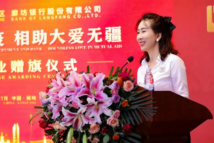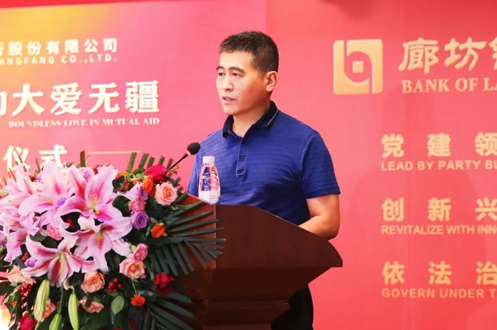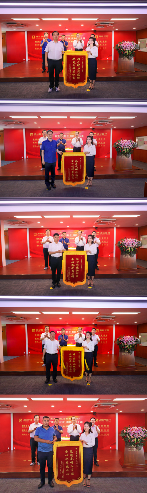在赠旗仪式上,廊坊高新区管委会副主任王玉龙,安次区政协副主席兼码头镇党委书记张雷、调河头镇党委书记卞雪涛、葛渔城镇镇长李亚利、东沽港镇镇长张庆春先后向廊坊银行赠送锦旗。