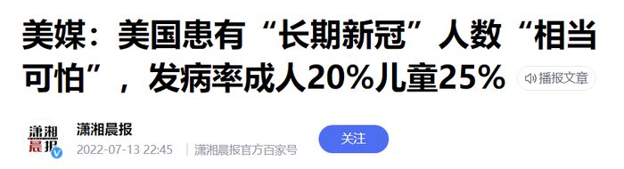 报道一,美国患有“长期新冠”症状人数“相当可怕”,发病率成人20% 儿童25%。