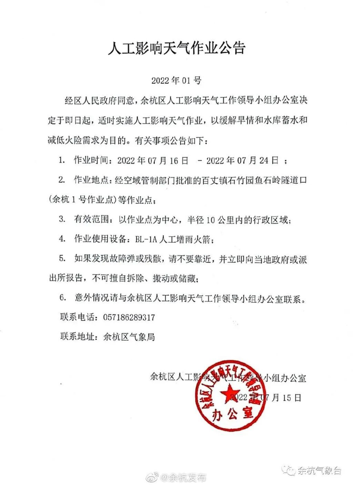 近日,杭州余杭区、临平区、富阳区、临安区等地相继发布人工影响天气作业公告。