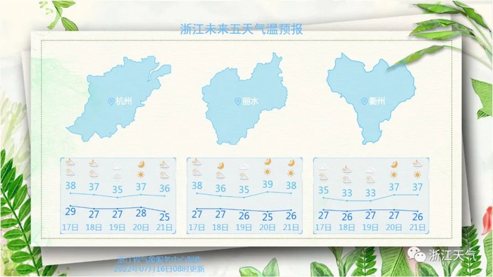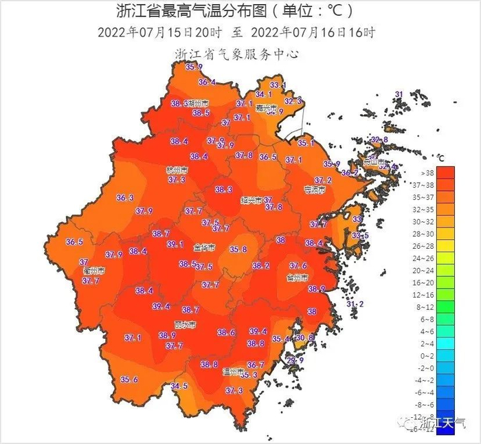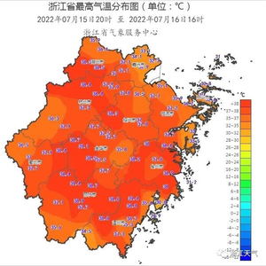 午后高温强度虽然没前几天猛,但高温的范围依旧很大。截止昨天16时,昨日最高气温有两地并列第一:永嘉和松阳,均为39.4℃。