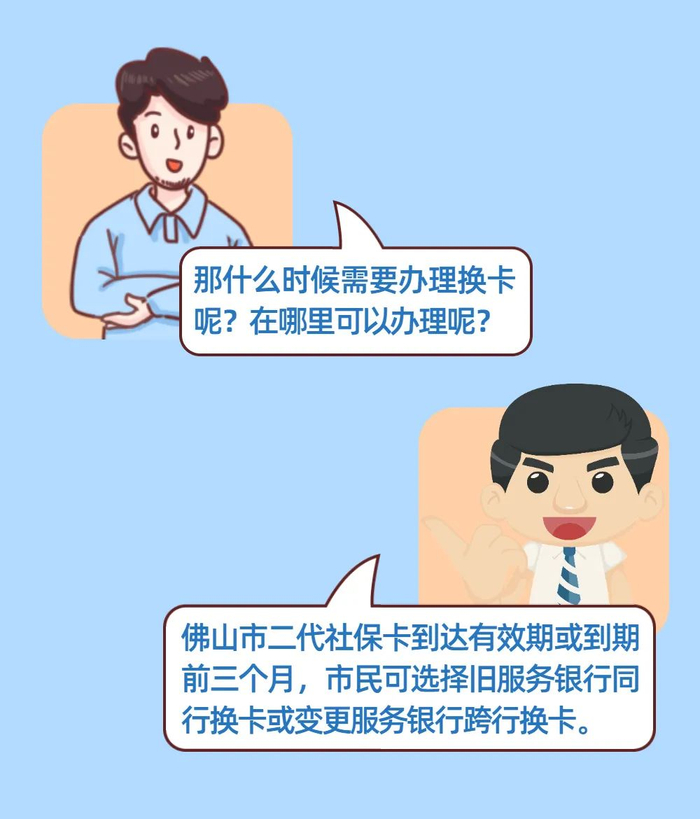 可带有效身份证原件、旧社保卡原件到旧发卡银行任意网点(推荐到快速发卡网点办理快速补换卡)或通过“佛山社保卡”微信小程序办理线上换卡,制卡成功后由银行网点通知领卡。