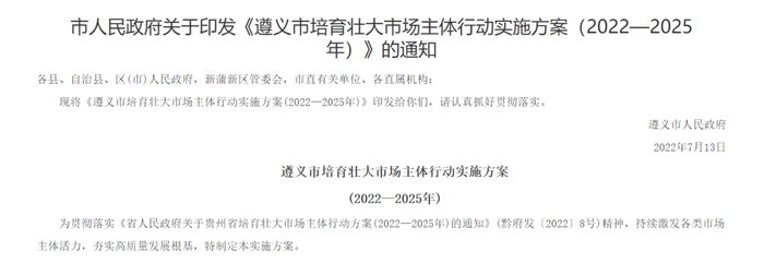 7月15日,遵义市人民政府关于印发《遵义市培育壮大市场主体行动实施方案(2022-2025年)》的通知(下称《方案》)。