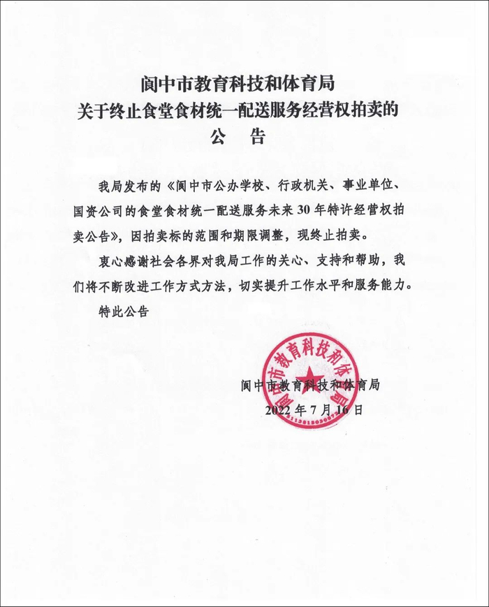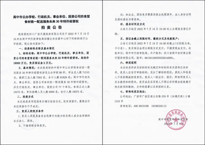 此前,四川南充市公共资源交易网阆中分网于7月7日发布了一则拍卖公告。拍卖标的物为:阆中市公办学校、行政机关、事业单位、国资公司的食堂食材统一配送服务未来30年特许经营权。起拍价1.8亿元,竞买保证金2万元。