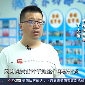 于璨伊父亲 于大伟:对我来说特别高兴,并且也很意外的。因为说实话对于她这个年龄来说,我们在11岁以下这个组别,六岁孩子跟十一岁的孩子年龄差距导致身体差距特别大,你想突破是很难的。所以我也想通过我们家一起共同努力,达到参加比赛的这个事情。
