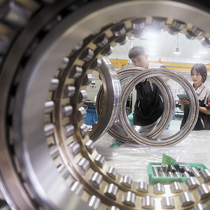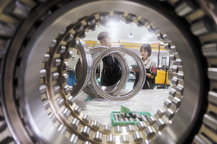在风电系列轴承装配现场,质检人员正精心检测产品质量。 鞠家田 摄