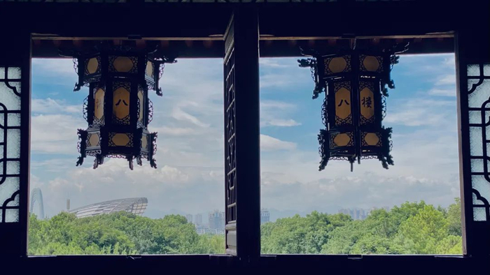 八咏楼虽然不再是至高点,但风景依旧美丽。站在二层阁楼上,八咏公园尽收眼底,天空依旧如千年前的澄净,远处千峰如水墨点就,双溪风景尚好。乘坐婺州游船,随着微波荡漾,享大都市的极尽浪漫,观万家灯火的流光溢彩。