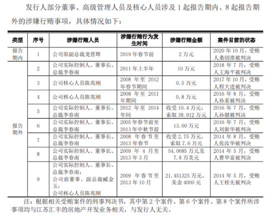 一是2005年至2019年,发行人实际控制人、时任高管、核心技术人员涉及9项行贿事项;