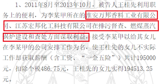 在对“家属”安排周全之际,判决书显示,王某先在淮安万邦香料工业有限公司、江苏宏邦化工科技有限公司在排污督查、燃煤蒸汽锅炉建设和查处方面谋取利益,大开“方便之门”。