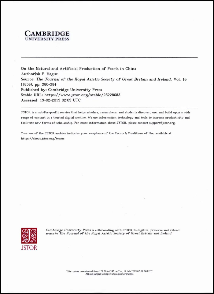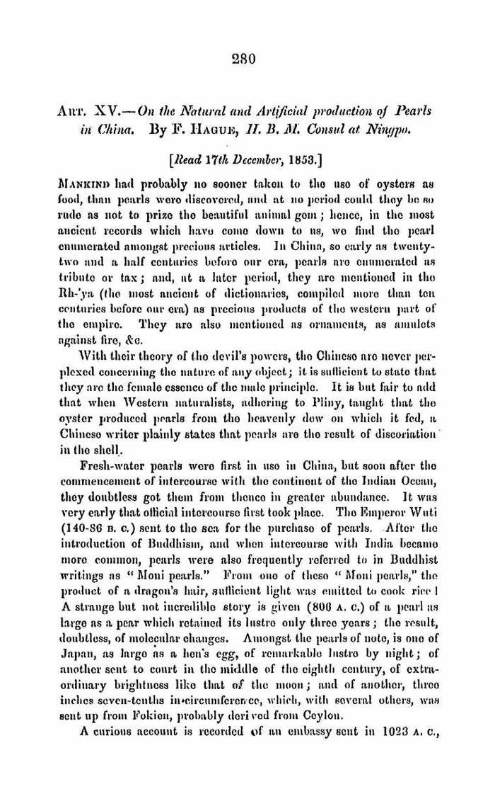 ▲1856年,英国领事海格(F .Hague)在《大不列颠及爱尔兰皇家亚洲学会》上发表了论文《中国自然及人工珍珠生产》