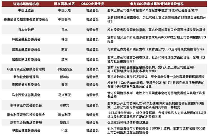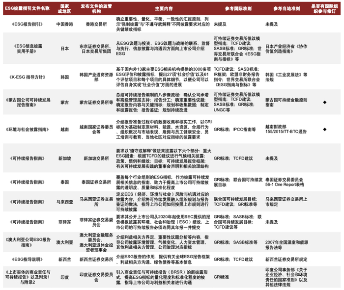 资料来源:中国证监会,中国生态环境部,上海证券交易所,国务院国资委,香港交易所,香港绿色和可持续金融跨机构督导小组,香港证券及期货事务监察委员会,日本金融厅,东京证券交易所,日本交易所集团,日本财务会计准则基金会,韩国金融服务委员会,韩国国会,韩国产业通商资源部,蒙古证券交易所,蒙古可持续金融协会,越南国家证券委员会,越南财政部,印度尼西亚金融服务管理局,印度尼西亚政府,新加坡金融管理局,新加坡交易所,泰国证券交易委员会,泰国证券交易所,马来西亚交易所,菲律宾证券交易委员会,澳大利亚证券交易所,澳大利亚养老金投资者委员会,澳大利亚审慎监管局,新西兰证券交易所,新西兰议会,印度公司事务部,印度证券交易委员会,中金公司研究部