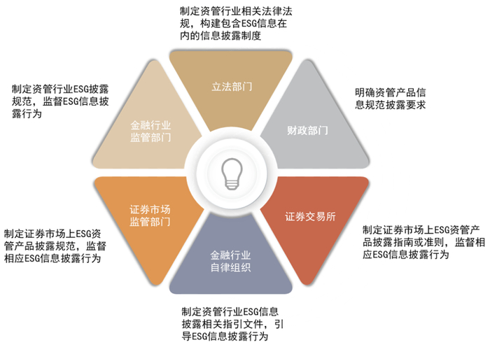 资管ESG信息披露监管体系建设的参与机构主要为立法部门、金融行业监管部门、财政部门、证券市场监管部门、证券交易所、金融行业自律组织等。资管行业ESG披露政策通常从金融机构与产品服务层面双管齐下,要求披露金融机构进行ESG投资相应的管理结构与政策,以及ESG资管产品和服务的投资策略、资产配置等信息。