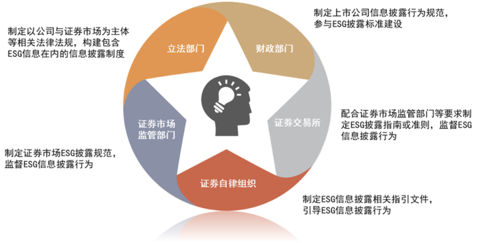 上市公司ESG信息披露监管体系建设的参与机构主要为立法部门、财政部门、证券市场监管部门、证券交易所、证券自律组织等。监管机构各司其职,采用独立监管或联合监管的方式,共同构成上市公司ESG信息披露监管主体框架。