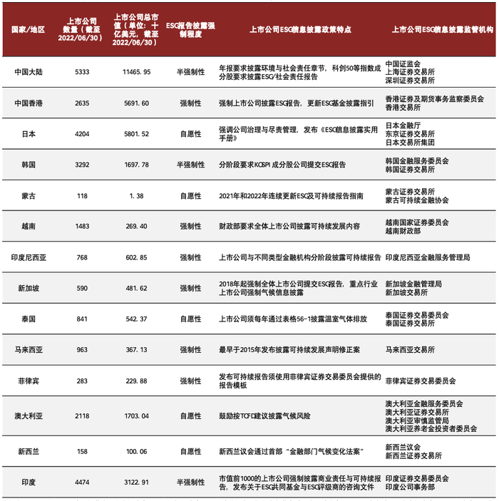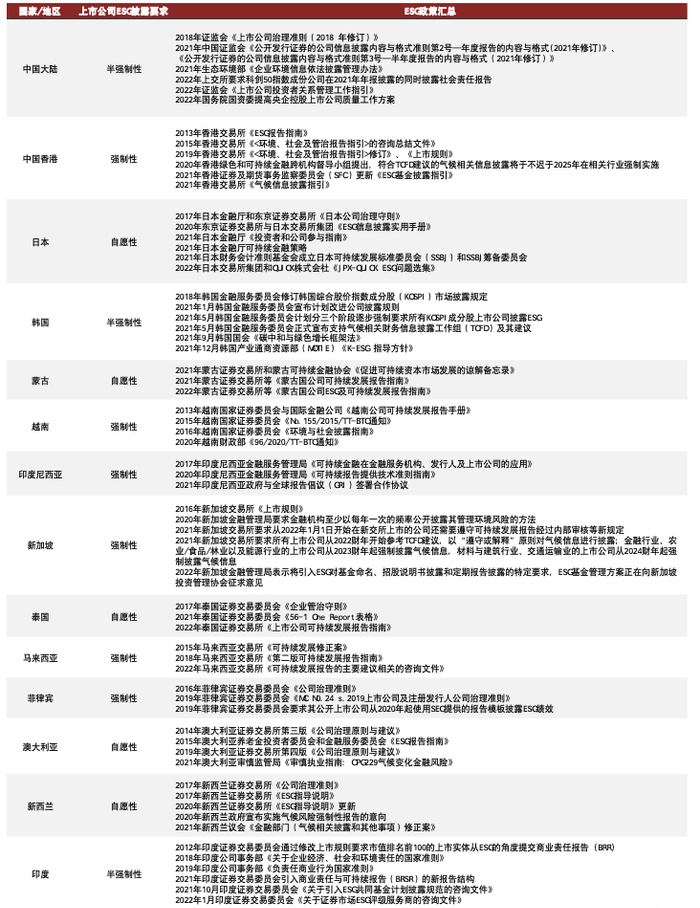 图表: 亚太主要国家/地区上市公司ESG信息披露监管政策要求