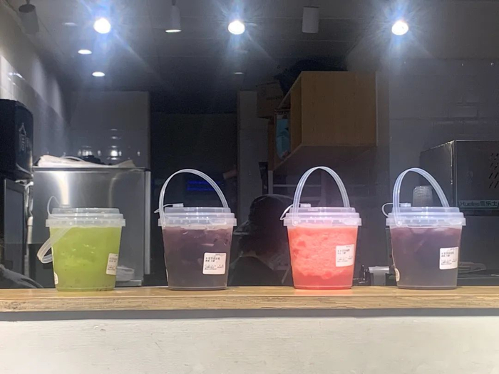 饮料的规格逐渐走向离谱,桶装、盆装,各种容器都被搬出来装入奶茶。