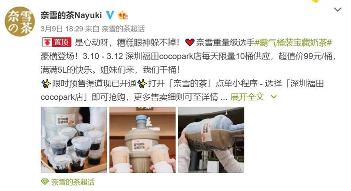 5天后的3月10日,奈雪的茶宣布在北京,深圳等地尝试过限量发售过5L装的“霸气桶装宝藏奶茶”,珍珠、奶茶都是平时用量的10倍,售价99元/桶。