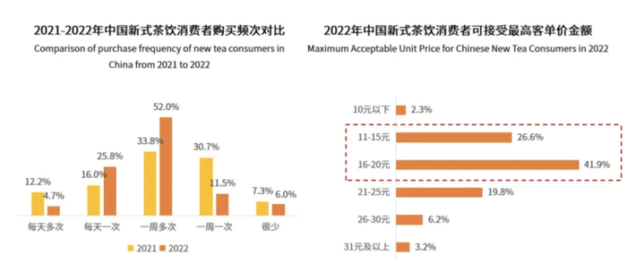 2022年94.0%的中国新式茶饮消费者每周购买新式茶饮;16-20元是新式茶饮消费者能接受最高客单价的区间,占比达41.9%。