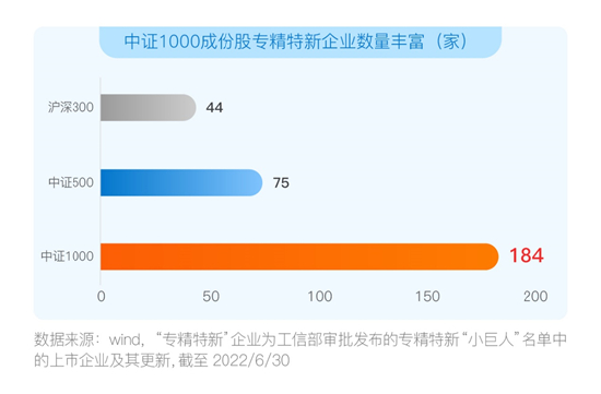 小市值,大成长。统计数据显示,中证1000指数更为聚焦高景气的新经济行业。目前该指数中的专精特新企业多达184家,占比18.4%,无论是绝对数、还是相对比,都高于沪深300和中证500。