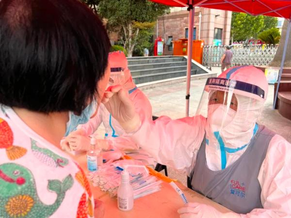 在静安区芷江西路街道,“大白”和“小蓝”依然在为防疫而坚持工作。很多时候身体已被“蒸熟”,但手下的采样动作依然麻利且一丝不苟。