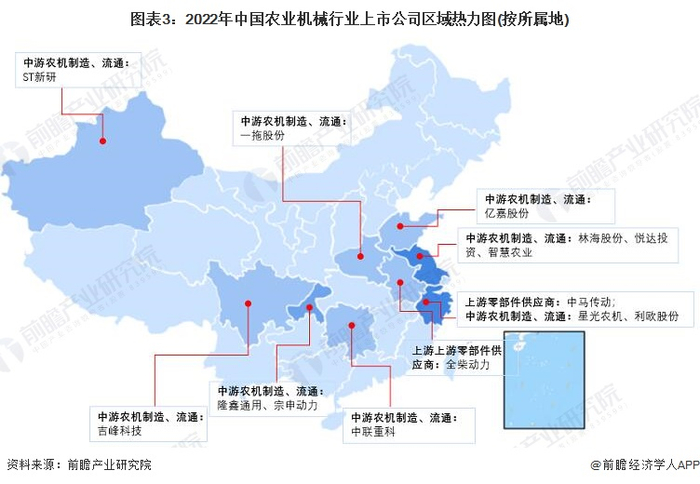 从企业的区域分布看,中国农机行业代表性企业主要分布于江浙、重庆等省市,新疆、湖南等也有部分农机企业。