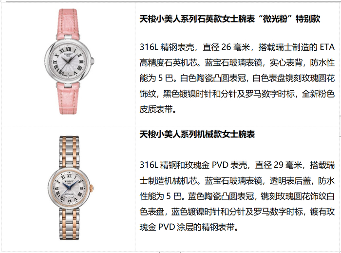 天梭希望通过“发光吧,小美人”主题活动鼓励、陪伴都市女性向光而行,无惧无畏。天梭小美人系列腕表由品牌瑞士总部女性设计师倾心打造,表盘中央精心镌刻代表天梭家族玫瑰的玫瑰圆花饰纹,搭载罗马数字时标和小三针设计,精致百搭。该系列于近期全新推出“微光粉”特别款,以粉色皮质表带演绎温润而不失力量的闪耀美学。