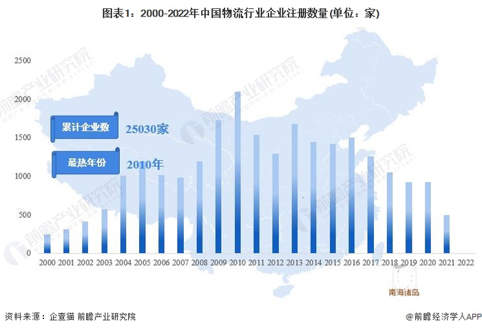 根据中国企业数据库企查猫,目前中国物流行业的主要企业共有25030家,其中以2010年为主要注册热潮,2010年全国物流注册企业数量达2103家。2021年全年,全国物流注册企业数量为499家,较2020年减少431家,截至2022年6月29日,全国尚未存在符合上述统计口径的新增物流企业。