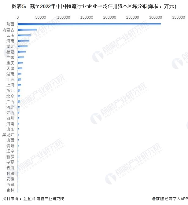 根据中国企业数据库企查猫,目前中国物流行业企业的平均注册资本区域分布中,陕西省相关企业的平均注册资本最高为311291万元,除此外,内蒙古、云南和海南的物流行业企业平均注册规模均在25000万以上,规模相对较大。