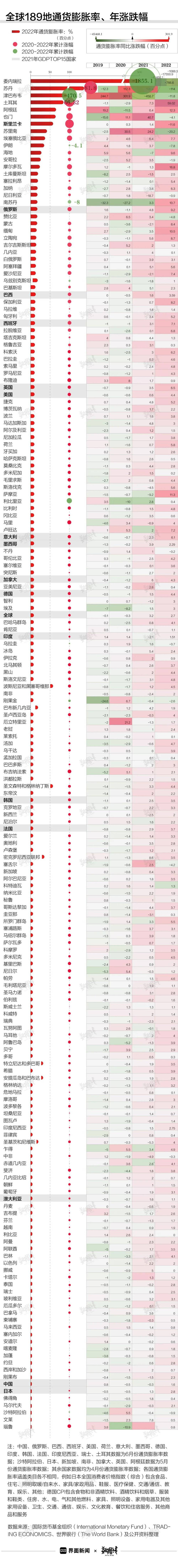 界面数据基于国际货币基金组织2022年4月数据、TRADING ECONOMICS 2022年5月、6月数据,绘制出全球189地通货膨胀率大排行。
