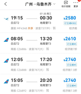 目前,兰新高铁部分区段因今年1月的地震中断运行,航空是游客入疆的主要途径。记者注意到,暑期各入疆航班折扣较平时均大为减少,不少航班已全价运行。