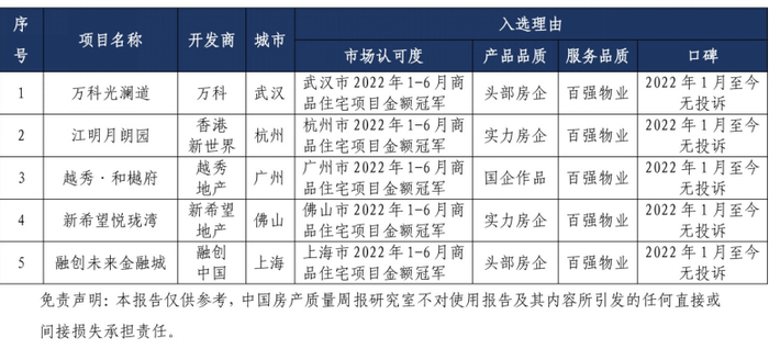 上周,中国房产质量周报舆情研究室基于市场认可度、产品品质、服务品质及口碑四个维度,甄选出本期明星楼盘,包括武汉市万科光澜道、杭州市江明月朗园、广州市越秀·和樾府、佛山市新希望悦珑湾和上海市融创未来金融城。