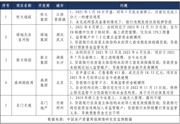 经统计,十个项目涉及的问题包括:房屋质量问题、项目停工、延期交付、实际交付与宣传不符、预售资金未进入监管账户、烂尾风险等。