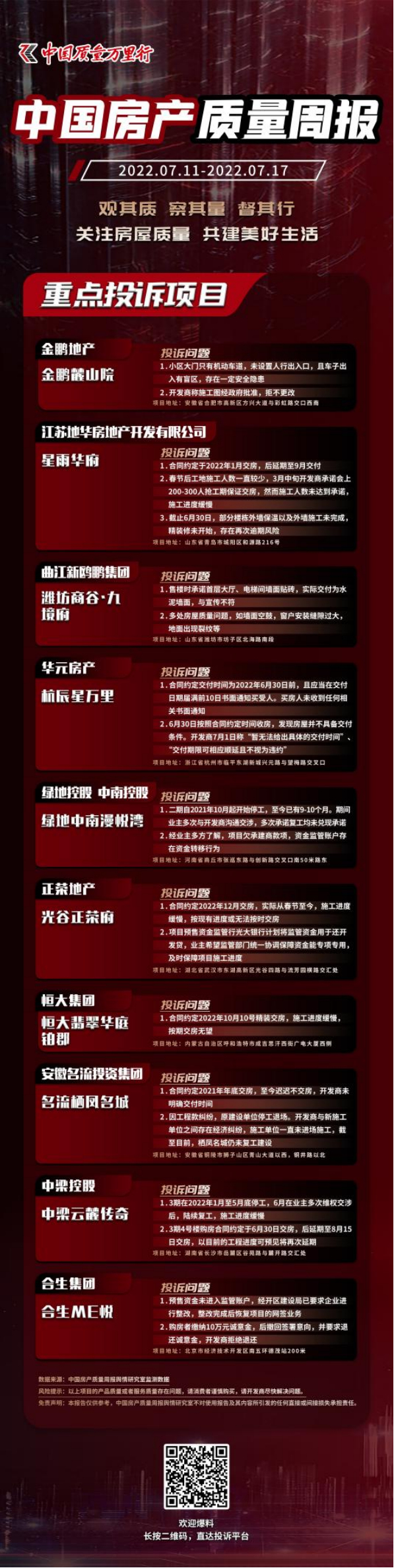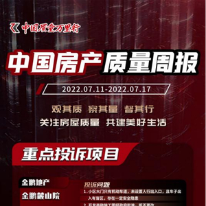 2022年7月11日-7月17日,中国质量万里行共收到62条业主投诉信息,加上网络监测的舆情数据,最终整理出10个需要重点关注的问题项目。具体来看,本周重点投诉项目涉及的开发商包括金鹏地产、江苏地华房地产开发有限公司、曲江新鸥鹏集团、华元房产、绿地控股、中南控股、正荣地产、恒大集团、安徽名流投资集团、中梁控股和合生集团。涉及的项目分别为金鹏麓山院、星雨华府、潍坊商谷·九境府、杭辰星万里、绿地中南漫悦湾、光谷正荣府、恒大翡翠华庭铂郡、名流栖凤名城、中梁云麓传奇和合生me悦。