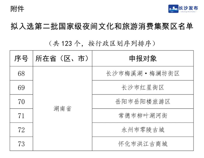 长沙有2个项目入围,分别是梅溪湖·梅澜坊街区和红星街区。2021年11月5日,文化和旅游部公布了《第一批国家级夜间文化和旅游消费集聚区》,长沙市五一商圈、长沙市阳光壹佰凤凰街两地入选。