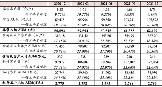 轻金融发现,招行的零售户均AUM最高曾超过了7万多元,从2016年开始呈现下降趋势,目前为6万多元。另一个数据显示,2021年招行零售AUM与金葵花及以上客户AUM增幅均为20%。这些数据在一定程度上展现了招行大财富管理的成效。