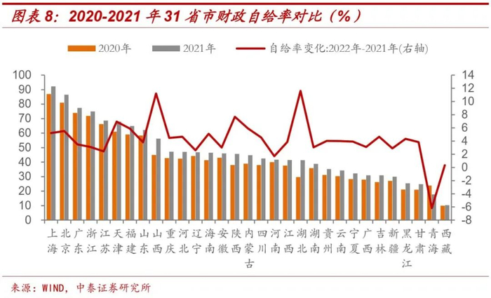 分区域看,31省市财政自给率差异较大。2021年上海的财政自给率最高(92.2%);北京位居第二,广东、浙江、江苏、天津、福建、山东等6省市均超过60%。此外,22个省市财政自给率低于50%,其中11个省市不足40%,主要集中在中西部、东北等经济欠发达地区。
