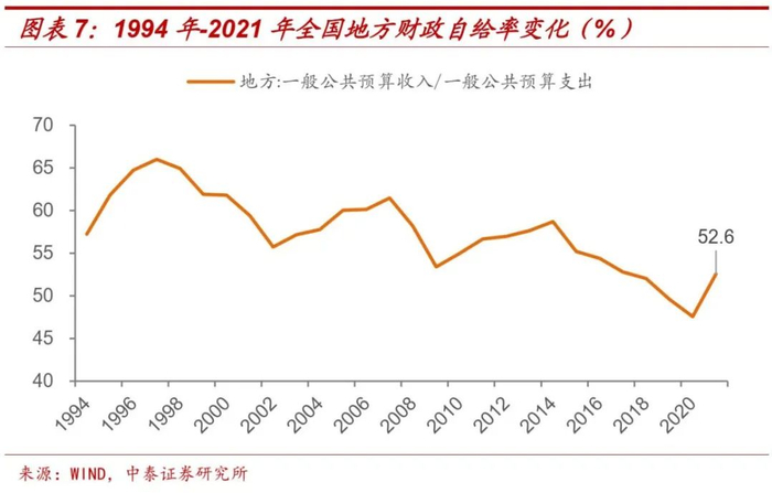 1994年以来,从全国层面看,地方一般公共预算收入占支出的比重波动下降,1997年最高时为66%,不过基本维持在50%以上。近年来随着财政收入增速逐渐放缓,民生和债务等刚性支出规模增加,地方财政收支平衡压力不断上升。2019和2020年地方财政自给率均降至50%以下,2021年回升至52.6%,和2017年水平相当。