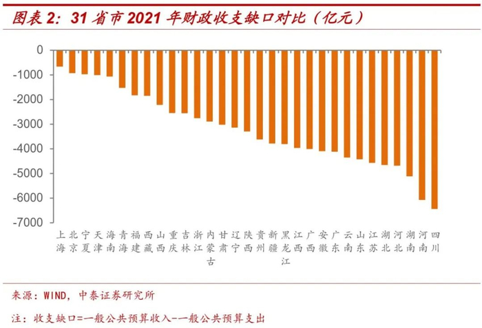 收支缺口的大小一定程度上反映出各地区财政状况的差异,但这一衡量方法可能不够严谨。毕竟在赤字财政背景下,如果从全年来看,31省市通常都不会有收支盈余。即使是上海市,2021年一般公共预算收入7772亿元,支出8431亿元,同样存在659亿元收支缺口。这一差额需要通过中央转移支付、发行地方政府一般债、使用结转结余及调入资金等方式弥补。
