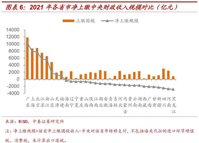 在包括分税制和转移支付的预算体系下,我们可以用各省市上缴中央的收入,减去该省收到的中央转移支付,得到各省市的净上缴规模,从而衡量各地区对于中央财政的贡献。2021年,全国仅有8个省市有正贡献,其中上海排名第二,净上缴中央财政收入达到7879亿元,几乎相当于中央对河南、黑龙江和四川三省的合计净补助规模。总理座谈会上提及的东南沿海5省市,均对中央财政有正贡献,2021年合计净上缴财政收入超过3万亿元,成为中央财政转移支付体系的重要支撑。