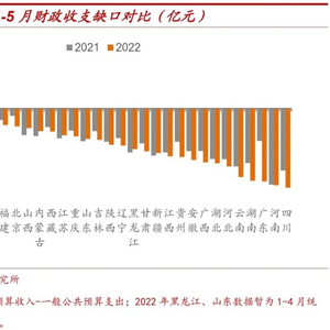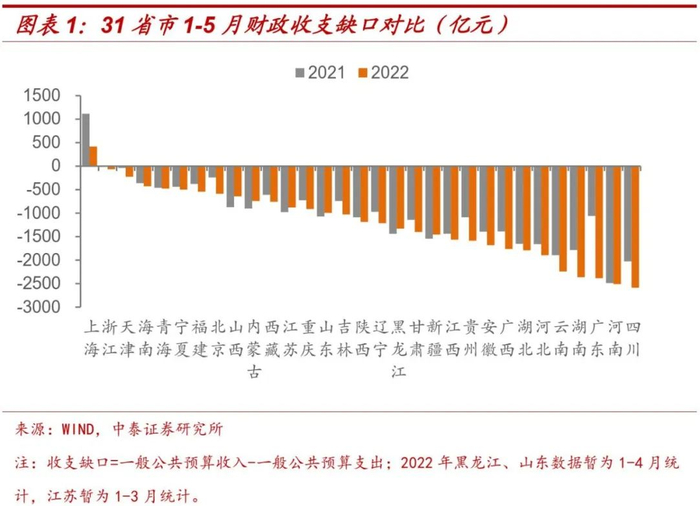 很多文章喜欢用一种简易方法对比各省市的财政状况,即根据一般公共预算收入和支出数据计算地方财政收支缺口。从今年1-5月数据看,受留抵退税、疫情冲击等影响,今年以来各地区财政收支平衡压力和去年同期相比明显上升;同时,作为上半年全国受疫情影响最严重的上海,和去年同期一样,成为31个省级行政区域中财政收支唯一保持盈余的地方。