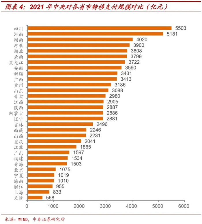 中央转移支付收入一般跟地区经济发展水平、财政实力、人口等因素直接相关。四川、河南作为中西部人口大省,经济发展相对落后,财政收支矛盾较为突出,获得的转移支付资金规模分列第一、二名;东部的天津、上海、浙江等省市,由于经济财政发展水平相对更高,人口更少,因此转移支付规模处于低位。
