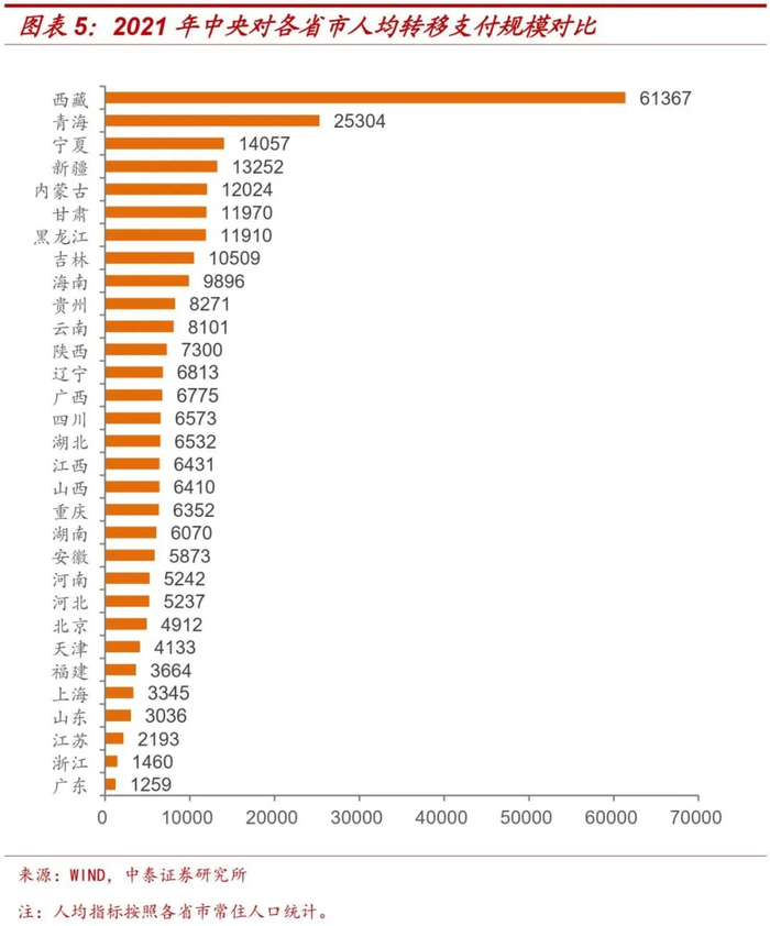2021年全国平均每人接受中央转移支付5816元,人均指标能够更准确地反映各省市接受中央帮扶的情况。具体来看:总量靠前的四川、河南两省接受的中央转移支付分别为6573元/人和5242元/人,在31省市中排名位居中下游;西藏由于特殊的地理位置和民族宗教环境,人均转移支付规模超过6万元;西部的青海、宁夏、新疆等少数民族集中分布省区,东北的黑龙江、吉林两省,人均规模均超过1万元;东部沿海的江苏、浙江、广东三省均不足3000元。整体来看,经济财政实力越强的地区,中央给予的人均转移支付规模越小,符合区域协同发展、共同富裕的基本原则。