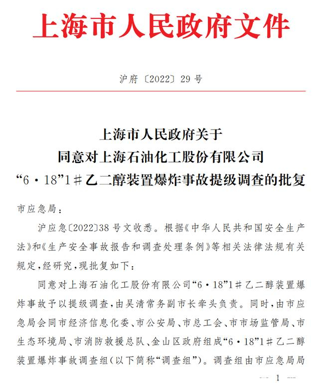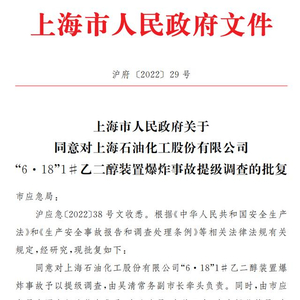 上海市人民政府于2022年7月11日发布了关于同意对上海石油化工股份有限公司“6?18”1#乙二醇装置爆炸事故提级调查的批复。
