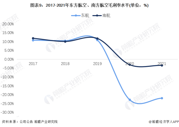 从民航运输行业的毛利率来看,在2020年疫情发生前,南方航空的毛利率水平较东方航空有微弱的优势,2019年,南航的毛利率为11.69%,东航的毛利率为10.78%。疫情后,南方航空表现出了更好地风险管理能力,毛利率水平下降较少。2021年,南航的毛利率水平为-3.49%而东航的毛利率水平则为-22.02%。