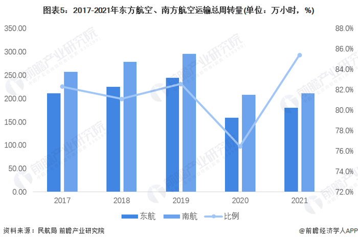从航空公司的运输总周转量来看,2017-2021年,南方航空的一直保持着领先。根据民航局的数据显示,2021年全年,南方航空完成运输总周转量212.11亿吨公里,较东方航空多出49.95亿吨公里。