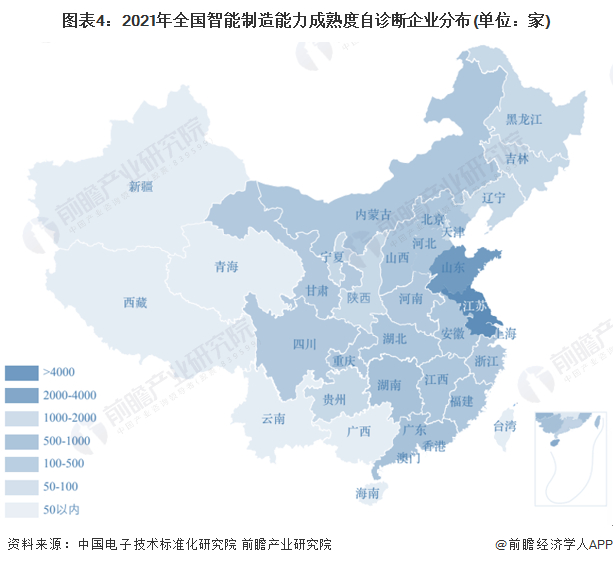 中国电子技术标准化研究院数据显示,截至2021年12月,全国20000多家企业通过平台开展智能制造能力成熟度自诊断,江苏、山东、北京、宁夏、陕西、江西等工业和信息化主管部门高度重视,有效推动标准应用。通过对自诊断数据进行分析,以期反映现阶段我国智能制造的发展情况。从区域参与度来看,江苏、山东、宁夏、北京、广东等地区积极落地,其中江苏有4654家参加自诊断、山东有2753多企业参与,宁夏有1108家企业参与,北京市、广东省、湖南省自诊断企业数量超过500家,安徽、福建、江西自诊断企业数量超过300家。