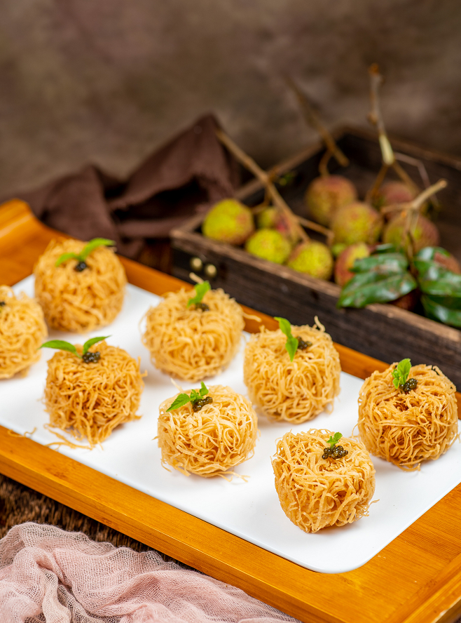 有食肆特意推出“荔枝红宴”,里面的每一道菜几乎都能看到荔枝的踪影。例如,金丝荔枝球,厨师把荔枝去核,在果肉中加入虾仁,裹上春卷皮丝在热油中翻滚几下,便成就了这道外表“酥脆”、内心“纯洁”的美味菜肴。