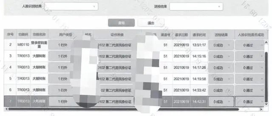 银行后台记录显示,李红的借记卡在6月19日那天共有7次操作涉及人脸识别,均显示识别成功通过,其中1次为借记卡申请,1次为登录密码重置,5次为大额转账,除了第一次不涉及活检,后6次操作“活检结果”均为成功。
