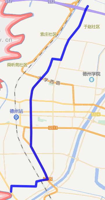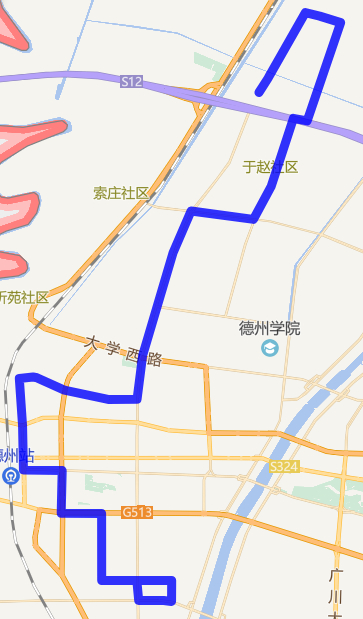 德州万达广场北站、东地大街、新河路、湖滨大道、新建路、新湖大街、东风路、解放大道、东方红路、迎宾大街、青年路、湖滨大道、萱蕙路、德兴大道、福盛路、小李路、湖滨大道、德州交投凯德现代冷链物流园。