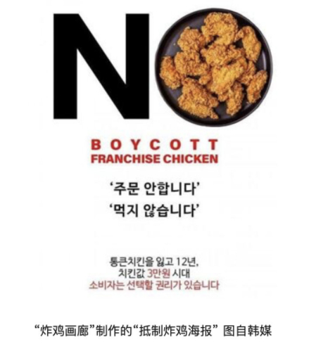 据报道,在该帖文中,“炸鸡画廊”模仿2019年韩国“抵制日货”运动的海报,制作了“抵制炸鸡”的海报,海报上有“抵制连锁店炸鸡”的英文字样,以及用韩文标注“不点(炸鸡)”“不吃(炸鸡)”的内容,最下方则写着,“炸鸡价格迈入3万韩元时代,消费者有自己选择的权利”。