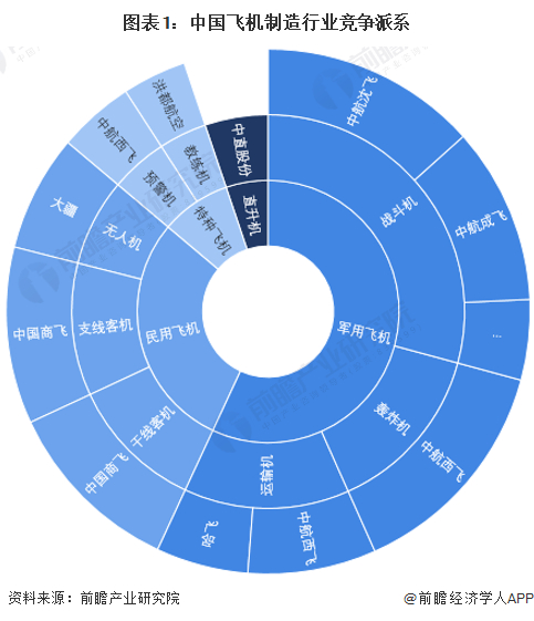 飞机制造行业具有较高的资金、技术与资质壁垒,因此国内的飞机制造行业的主要市场参与者均为国有集团企业。在国内的飞机制造领域,形成了以中国商飞和中航工业集团为双核心的民用军用飞机制造体系。